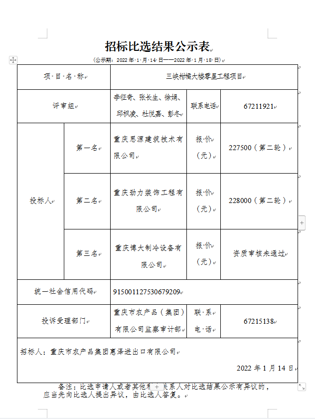 三峽柑橘大樓零星工程項目中標結果公示